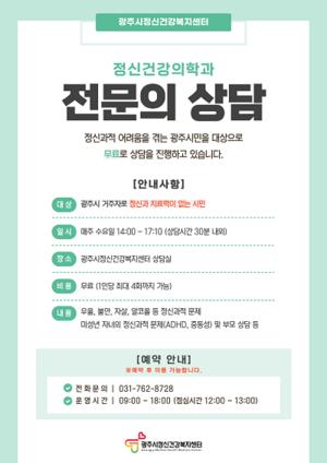 ±¤ÁÖ½ÃÁ¤½Å°Ç°º¹Áö¼¾ÅÍ´Â Áö¿ª ÁÖ¹ÎÀÇ Á¤½Å°Ç° ÁõÁø°ú ½É¸®Áö¿ø °È¸¦ À§ÇØ 2¿ùºÎÅÍ Á¤½Å°Ç°ÀÇÇаú Àü¹®ÀÇ ¹«·á »ó´ãÀ» ¿î¿µÇϰí ÀÖ´Ù°í 2...