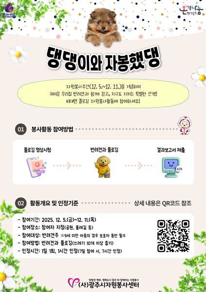 Âü¿©´ë»óÀº 1365ÀÚ¿øºÀ»çÆ÷Åп¡ ȸ¿ø°¡ÀÔÇÑ ¹Ý·Á°ßÁÖÀ̸ç, 9¼¼ ¹Ì¸¸ÀÇ ¾Æµ¿Àº º¸È£ÀÚ µ¿¹Ý ½Ã Âü¿© °¡´ÉÇÏ´Ù. Ȱµ¿ ±â°£ µ¿¾È ¹Ý·Á°ß°ú Ç÷αëÀ» ÁøÇàÇÑ ÈÄ, °á°úº¸°í¼¸¦ Á¦ÃâÇϸé 1ÀÏ ÃÖ´ë 1ȸ, 1½Ã°£ÀÇ ºÀ»çȰµ¿ ½Ã°£ÀÌ ÀÎÁ¤µÈ´Ù.