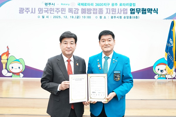 ±¤ÁÖ½Ã¿Í ±¹Á¦·ÎŸ¸® 3600Áö±¸ ±¤ÁÖ ·ÎŸ¸®Å¬·´Àº 19ÀÏ ¿Ü±¹ÀÎ ÁÖ¹ÎÀÇ °Ç° º¸È£¿Í µ¶°¨ ¿¹¹æÀ» À§ÇÑ ‘¿Ü±¹ÀÎ ÁֹΠµ¶°¨ ¿¹¹æÁ¢Á¾ Áö¿ø»ç¾÷’ ÃßÁø¿¡ °üÇÑ ¾÷¹«Çù¾à(MOU)À» ü°áÇß´Ù.