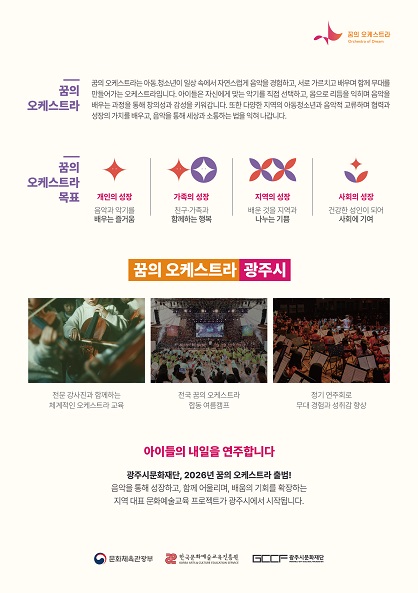 ‘²ÞÀÇ ¿ÀÄɽºÆ®¶ó’´Â º£³×¼ö¿¤¶óÀÇ ¹«»ó À½¾Ç±³À° ÇÁ·Î±×·¥ ¿¤ ½Ã½ºÅ׸¶(El Sistema)¸¦ ¸ðµ¨·Î ÇÑ ¹®È¿¹¼ú±³À° »ç¾÷À¸·Î, Áö¿ª ¾Æµ¿·Ã»¼Ò³âµéÀÌ ¿ÀÄɽºÆ®¶ó Ȱµ¿À» ÅëÇØ Çùµ¿°ú ¼ÒÅëÀÇ °¡Ä¡¸¦ ¹è¿ì°í, À½¾ÇÀ» ¸Å°³·Î °Ç°ÇÑ »çȸ ±¸¼º¿øÀ¸·Î ¼ºÀåÇÒ ¼ö ÀÖµµ·Ï Áö¿øÇÏ´Â °ÍÀ» ¸ñÇ¥·Î ÇÑ´Ù.