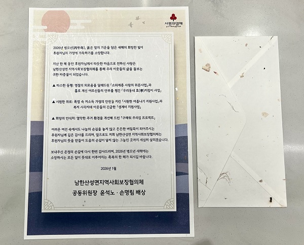 ±¤Áֽà ³²Çѻ꼺¸é Áö¿ª»çȸº¸ÀåÇùÀÇü´Â 2026³â º´¿À³â(ܰçíÒ´) »õÇØ¸¦ ¸Â¾Æ Áö³ ÇÑ ÇØ µ¿¾È Áö¿ª ³» ¾î·Á¿î ÀÌ¿ôÀ» À§ÇØ ³ª´®À» ½ÇÃµÇØ ¿Â ÈÄ¿øÀڵ鿡°Ô °¨»çÀÇ ¸¶À½À» ´ãÀº ¼Çѹ®À» ¹ß¼ÛÇß´Ù°í 21ÀÏ ¹àÇû´Ù.