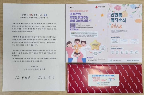 ±¤Áֽà ½ÅÇöµ¿ Áö¿ª»çȸº¸ÀåÇùÀÇü´Â 2025³â ÇÑ ÇØ µ¿¾È ½ÅÇöµ¿ ³» ¾î·Á¿î ÀÌ¿ôÀ» À§ÇØ ¼º±Ý°ú ¹°Ç°À» ±âºÎÇÑ ÈÄ¿øÀÚ 183¸í¿¡°Ô °¨»ç ¼ÇÑÀ» ¹ß¼ÛÇß´Ù°í 12ÀÏ ¹àÇû´Ù.
