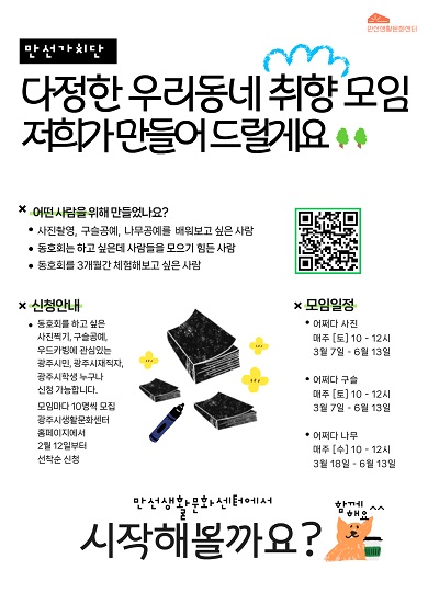 (Àç)±¤Áֽù®ÈÀç´Ü(´ëÇ¥ÀÌ»ç ¿À¼¼¿µ) ¸¸¼±»ýȰ¹®È¼¾ÅͰ¡ ±¤ÁֽùÎÀÇ »ýȰ¹®È Ȱµ¿ ±â¹ÝÀ» È®´ëÇϰí ÀÚ¹ßÀûÀÎ µ¿È£È¸ Çü¼ºÀ» Áö¿øÇϱâ À§ÇØ 2026³â µ¿È£È¸ ¹ß±¼»ç¾÷ <¸¸¼±°¡Ä¡´Ü> 1±â Âü¿©ÀÚ¸¦ ¸ðÁýÇÑ´Ù.