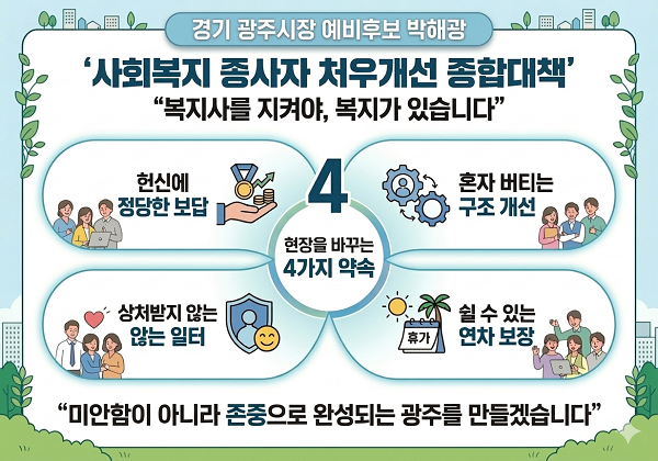 ¹ÚÇØ±¤ °æ±â ±¤ÁÖ½ÃÀå ¿¹ºñÈ帴Â, »çȸº¹Áö ÇöÀå¿¡¼ ¹¬¹¬È÷ ½Ã¹ÎÀ» µ¹º¸°í ÀÖ´Â Á¾»çÀÚµéÀ» À§ÇÑ ‘»çȸº¹Áö Á¾»çÀÚ Ã³¿ì°³¼± Á¾ÇÕ´ëÃ¥’ °ø¾àÀ» ¹ßÇ¥Çß´Ù.