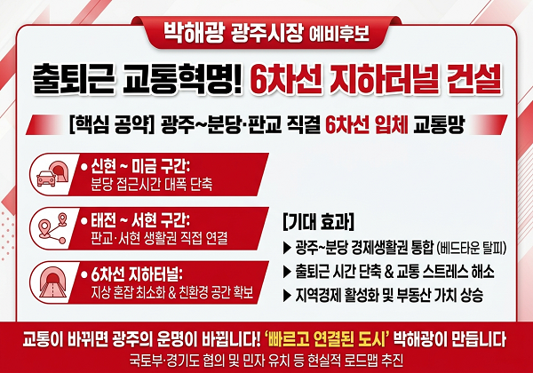 ¹ÚÇØ±¤ °æ±â ±¤ÁÖ½ÃÀå ¿¹ºñÈ帴 »ó½ÀÀûÀÎ ±³ÅëÁ¤Ã¼·Î °íÅë ¹Þ´Â ±¤ÁÖ ½Ã¹ÎÀÇ ÃâÅð±Ù ȯ°æÀ» ȹ±âÀûÀ¸·Î °³¼±Çϱâ À§ÇØ ‘½ÅÇö–¹Ì±Ý’, ‘ÅÂÀü–¼Çö’À» ¿¬°áÇÏ´Â 6Â÷¼± ÁöÇÏÅͳΠ°Ç¼³ °ø¾àÀ» ¹ßÇ¥Çß´Ù.